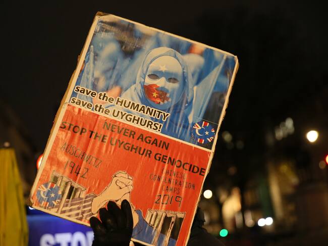 LONDON, UNITED KINGDOM - DECEMBER 9: People stage a protest in front of the Chinese Embassy after the Uyghur Tribunal ruled that China committed genocide against Uyghurs and other ethnic minorities through policies such as coerced birth control and sterilization in London, United Kingdom on December 9, 2021. (Photo by Hasan Esen/Anadolu Agency via Getty Images) / Anadolu Agency