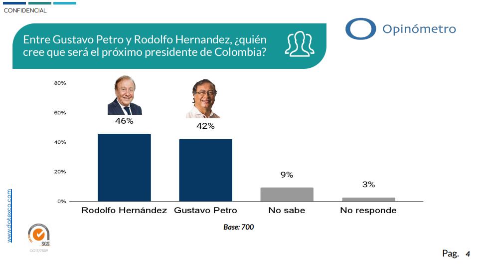 El Opinómetro para W Radio reveló que el 46% de los encuestados cree que Rodolfo Hernández será presidente, mientras que el 42% considera que será Gustavo Petro quien llegará a la Presidencia. El 9% no sabe y el 3% no responde.