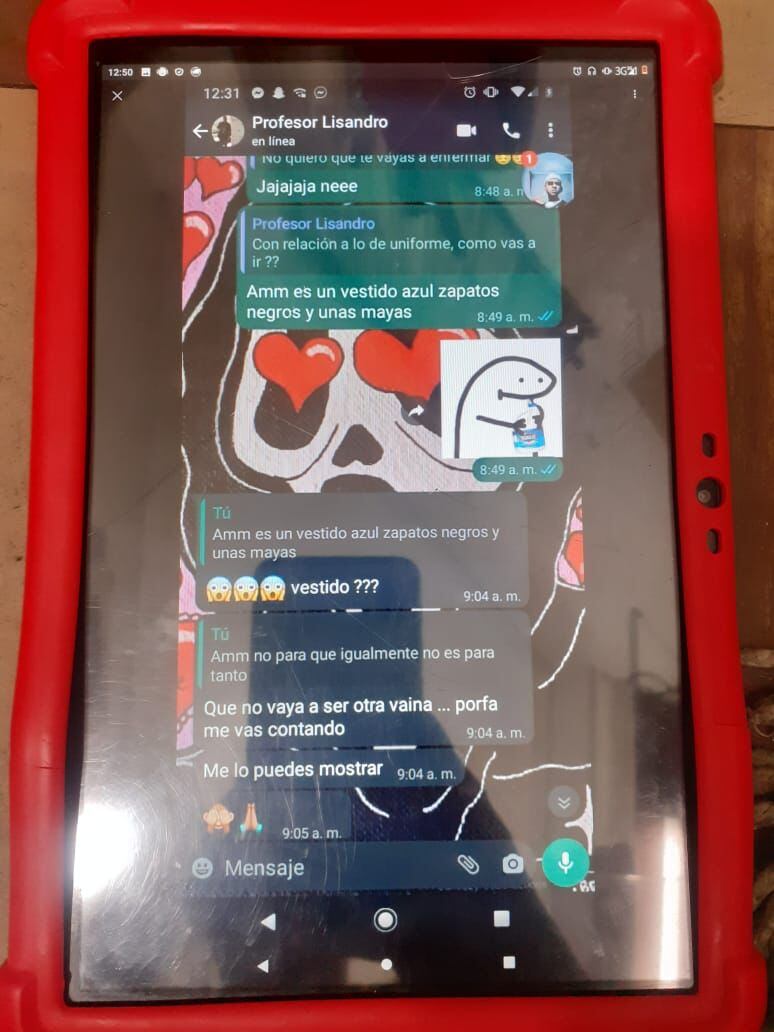 Pero este no es el único caso, La W conoció chats donde el coordinador Terryl habla con una estudiante menor de edad. Una de las conversaciones se inicia cuando ella le pregunta si se puede ir en ropa particular porque su uniforme se mojó, él le dice que sí y le pregunta cómo se irá vestida: