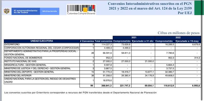 - EnTerritorio (9 contratos por 114.227 millones y ejecutó $ 6.679 millones)