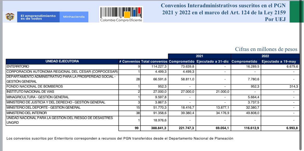 - EnTerritorio (9 contratos por 114.227 millones y ejecutó $ 6.679 millones)