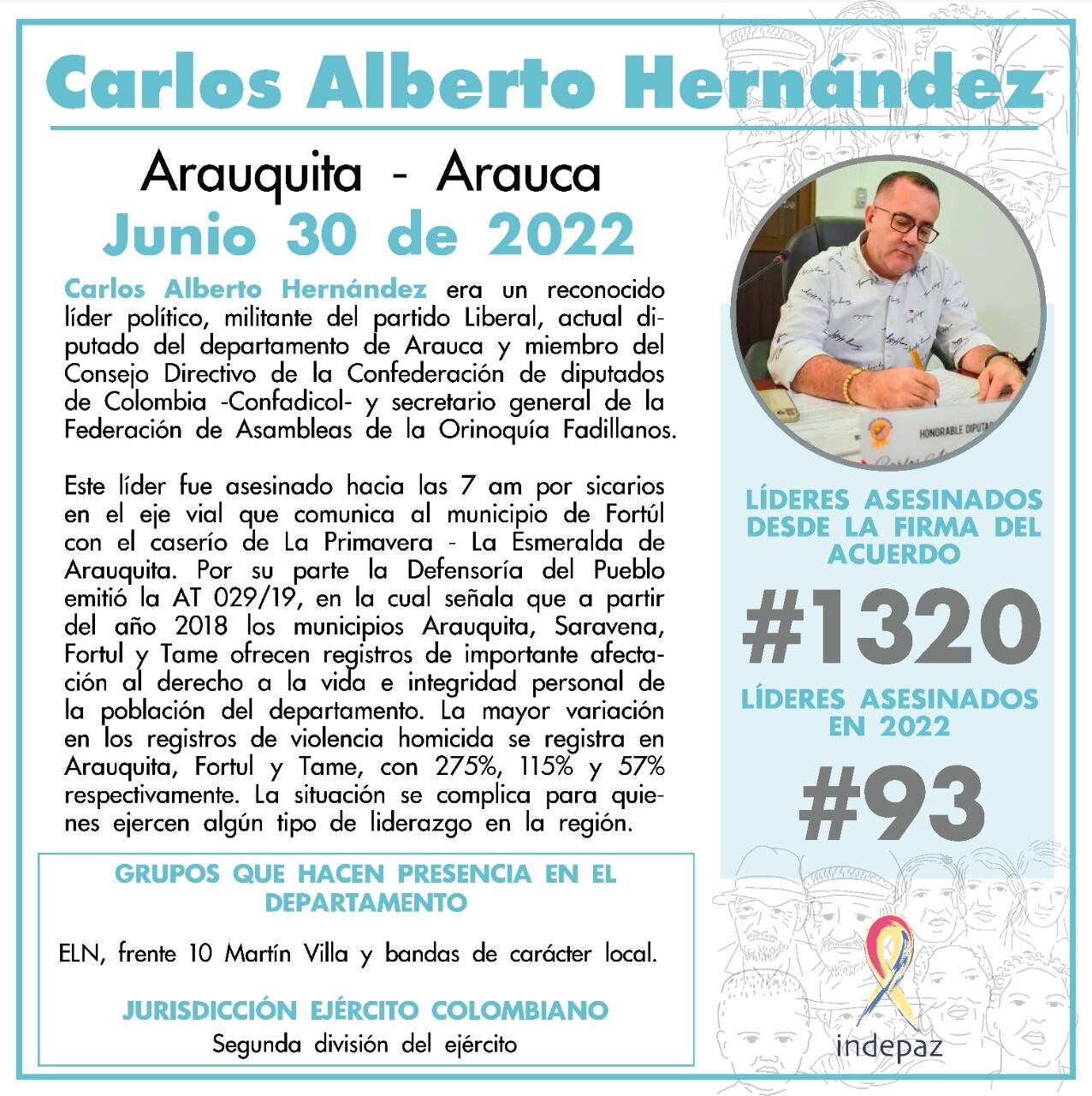Hernández era diputado de la Asamblea Departamental de Arauca desde 2016 y su periodo iba hasta el próximo año, y según reportaron medios locales fue asesinado cuando se desplazaba sin escoltas por la carretera que conecta a los municipios de Fortul y La Esmeralda, por una zona rural donde hay presencia de grupos armados.