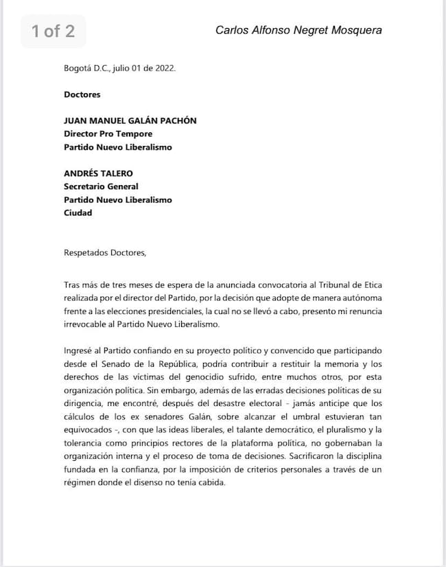 Se siguen sumando más bajas al partido Nuevo Liberalismo: en esta oportunidad, se trata de Carlos Negret, aspirante al Senado por esta colectividad, quien presentó su renuncia irrevocable a través de un comunicado de dos páginas.