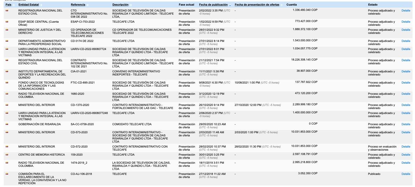 Pero ese no es el único contrato de Telecafé con este objeto, pues también tuvo un contrato con el Ministerio de Justicia por más de 1.800 millones de pesos: