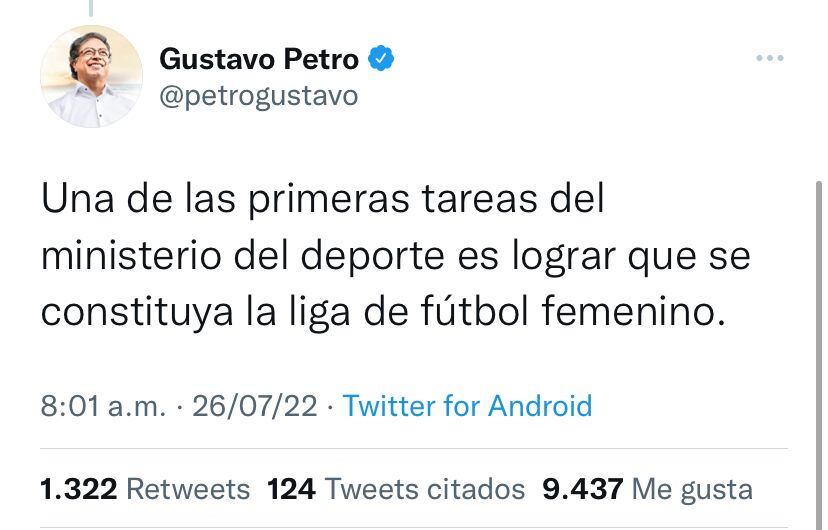 El presidente electo, Gustavo Petro, se comprometió con la liga femenina. En su cuenta de Twitter expresó: “Una de las primeras tareas del Ministerio del Deporte es lograr que se constituya la liga de fútbol femenino”.