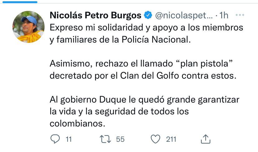 “Basta ya del plan pistola que inició el 9 de mayo en el paro armado del Clan del Golfo. ¿Hasta cuándo esta escalada violencia que le está arrebatando la vida a nuestros héroes? Y ahora, salen congresistas a decir que les duele, descarados, muchos en los diferentes paros ayudaron a esa narrativa de odio en contra de nuestros uniformados”, dijo Suárez.