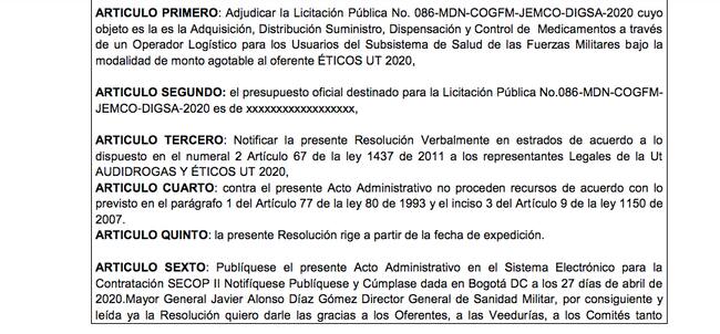 La W conoció que la Unión Temporal Éticos, integrada por Éticos Serrano Gómez Ltda, la misma compañía de los Char, en 2020 se quedó con la licitación de Sanidad Militar, un proceso por más de 379.000 millones de pesos para adquirir y distribuir los medicamentos únicamente para las Fuerzas Militares. Este contrato se firmó de 2020 a 2022 a través de un proceso de licitación pública.