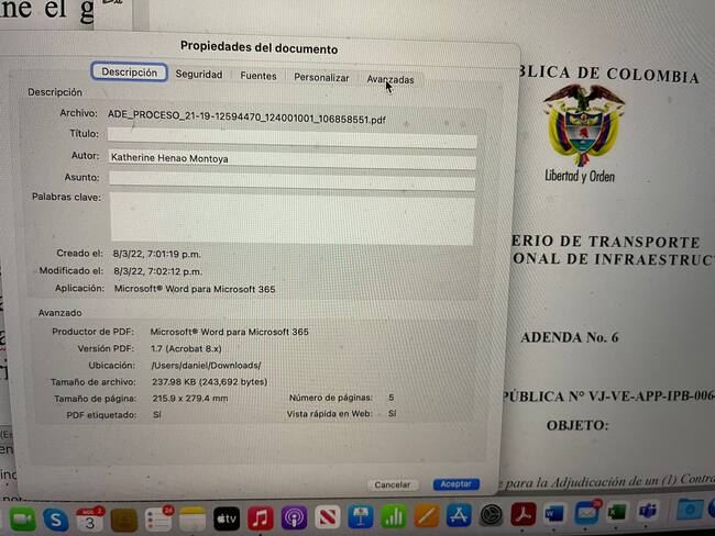 La metadata del documento conocido hace pocas horas por El Reporte Coronell muestra que fue modificado anoche a las 7:02 minutos y 12 segundos e identifica al autor de la modificación. Es una persona llamada Katherine Henao Montoya.