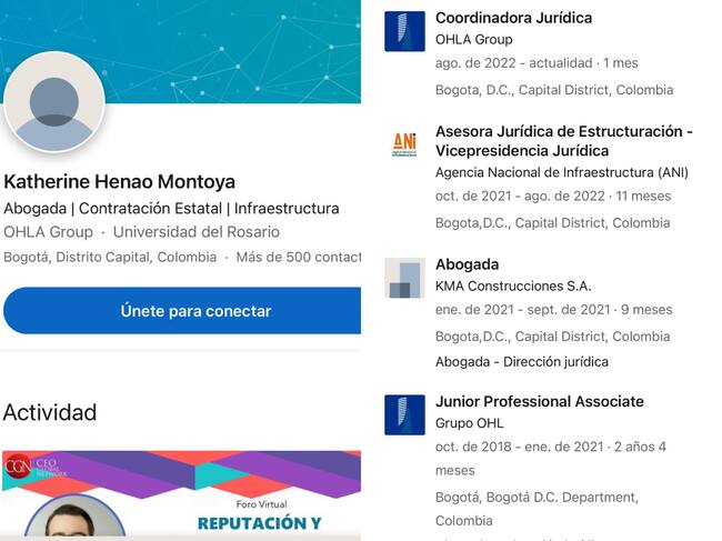 Las sorpresas no terminan ahí. Katherine Henao Montoya es una abogada que, de acuerdo con su hoja de vida publicada por ella misma en LinkedIn, trabajó hasta este mes en la Agencia Nacional de Infraestructura, ANI, como asesora jurídica de estructuración, pero, de acuerdo con la información que ella hizo pública, desde hace unos días no trabaja en la ANI. Ahora es coordinadora jurídica de OHLA, otra constructora española que también estuvo interesada en el megacontrato del Canal del Dique.
