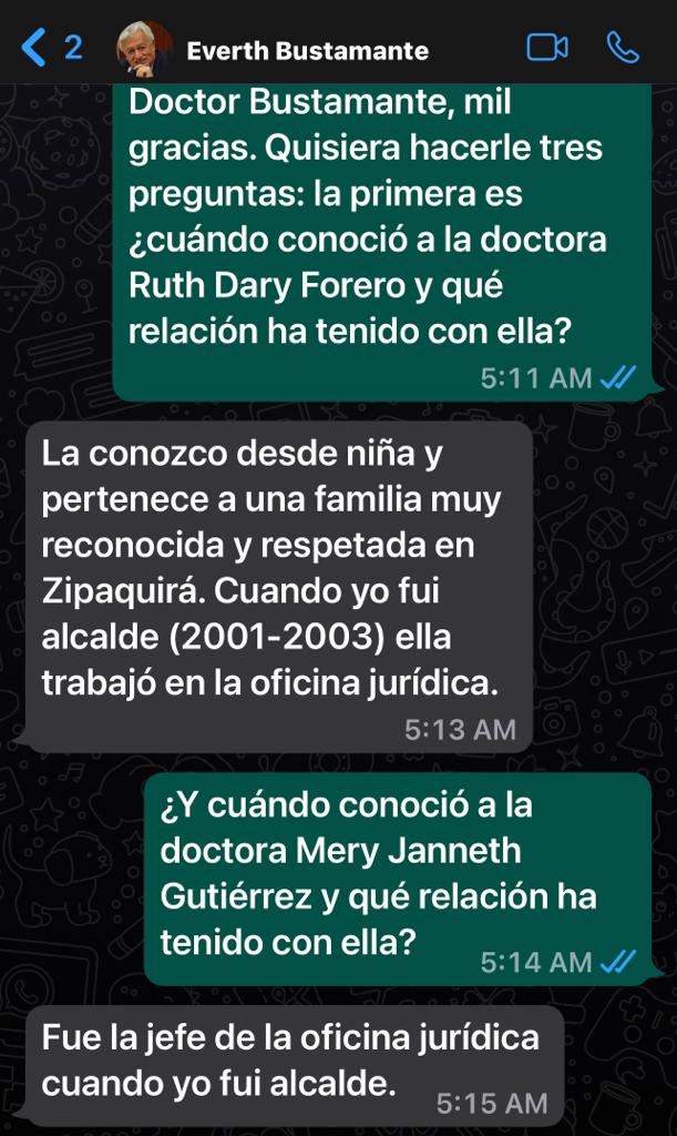 La primera pregunta que le hice por WhatsApp al exdirector de Coldeportes fue: ¿Cuándo conoció a la doctora Ruth Dary Forero y qué relación ha tenido con ella? Él respondió: “La conozco desde niña y pertenece a una familia muy reconocida y respetada en Zipaquirá. Cuando yo fui alcalde (2001-2003) ella trabajó en la oficina jurídica”.