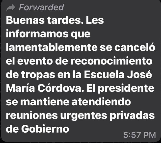 - “Buenas tardes. Les informamos que lamentablemente se canceló el evento de reconocimiento de tropas en la Escuela José María Córdoba. El presidente se mantiene atendiendo reuniones urgentes, privadas de gobierno”.