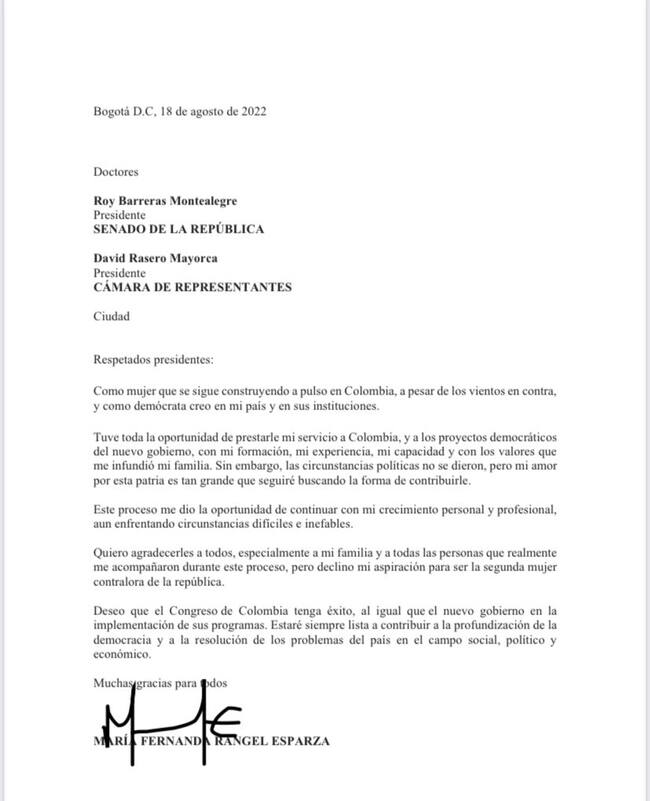 Horas antes de la elección del nuevo contralor general de la República, la candidata María Fernanda Rangel Esparza, una de las más opcionadas para resultar elegida en este cargo, renunció a su aspiración a través de una carta.