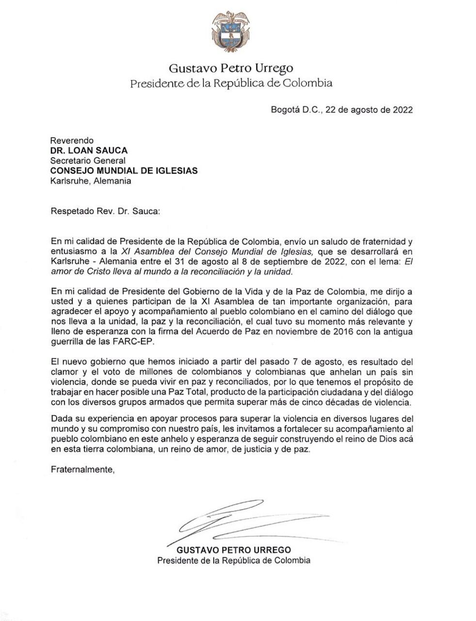 En esta carta, señalan que la paz fue interrumpida en el gobierno del expresidente Iván Duque: “Tenemos la disposición e intereses de buscar la paz, por lo que agradecemos al Consejo Mundial de Iglesias su apoyo hacia la solución política”.