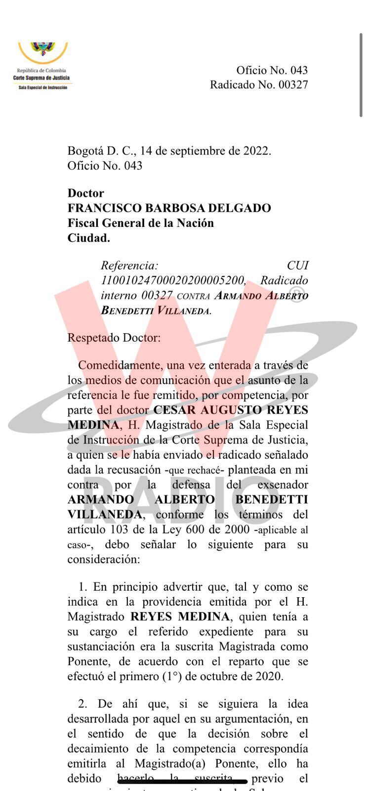 La W conoció en primicia un oficio que envió la magistrada Cristina Lombana al fiscal General, Francisco Barbosa, en la que le pide devolver el expediente en contra del exsenador Armando Benedetti a la Sala Especial de Instrucción.