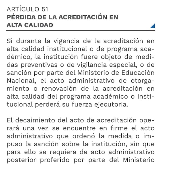 - Artículo 51. Pérdida de la acreditación en alta calidad. Si durante la vigencia de la acreditación en alta calidad institucional o de programa académico, la institución fuere objeto de medidas preventivas o de vigilancia especial o de sanción por parte del Ministerio de Educación Nacional, el acto administrativo de otorgamiento o renovación de la acreditación en alta calidad del programa académico o institucional perderá su fuerza ejecutoria. El decaimiento operará una vez se encuentre en firme el acto administrativo que ordenó la medida o impuso la sanción sobre la institución, sin que para ello se requiera de acto administrativo posterior por parte del Ministerio.
