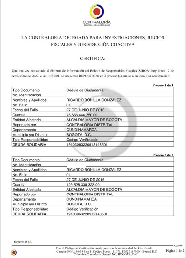 Y además está reportado en la Contraloría General con tres sanciones fiscales, es decir tiene una millonaria multa.
