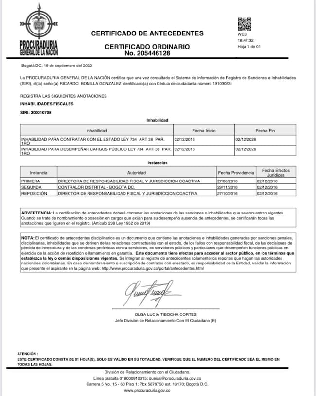 Cabe recordar que Bonilla está inhabilitado por la Procuraduría General de la Nación hasta el 2026 para ocupar cualquier cargo en el gobierno por el caso de la reducción de tarifas de TransMilenio.