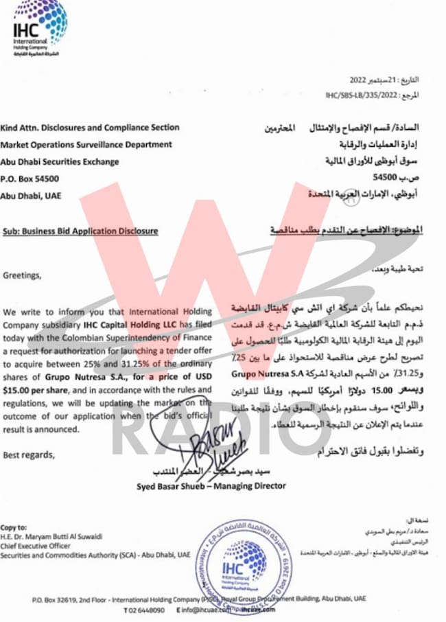 La carta de la empresa árabe IHC para tener hasta el 31,2% de Nutresa: