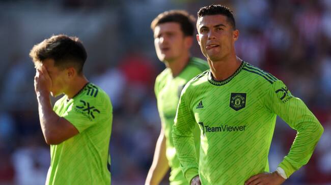Cristiano Ronaldo se lamenta incrédulo, tras uno de los cuatro goles del Brentford. / Getty Images / Catherine Ivill