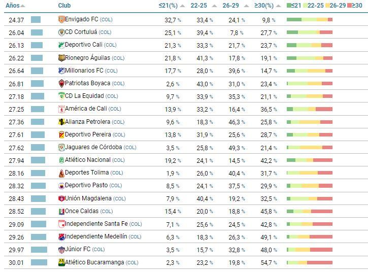 En la Liga colombiana, el equipo antioqueño es seguido por Cortuluá y Águilas Doradas, con un porcentaje de 25.1% y 21.8% para los jugadores de 21 años o menos en su plantel.