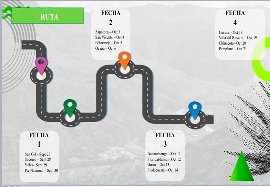 Nuestro recorrido iniciará en San Gil y desde allí recorreremos los municipios de Socorro, Vélez y Puente nacional. Posteriormente, estaremos visitando Zapatoca, San Vicente, Barrancabermeja y Ocaña. Bucaramanga, Floridablanca, Girón y Piedecuesta también hacen parte de nuestra expedición que finalizará en Norte de Santander con las visitas a Cúcuta, Villa del Rosario, Chinácota y Pamplona