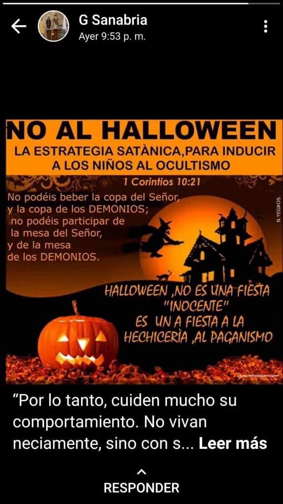 La pieza también dice que el Halloween “no es una fiesta inocente, es una fiesta a la hechicería al paganismo, por lo tanto, cuiden mucho su comportamiento”.
