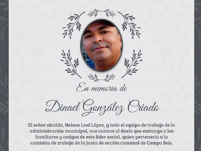 “Como administración municipal estamos consternados por la muerte del líder comunal, Dinael González Criado, quien hacía parte de la comisión de trabajo de la junta de acción comunal de Campo Seis.