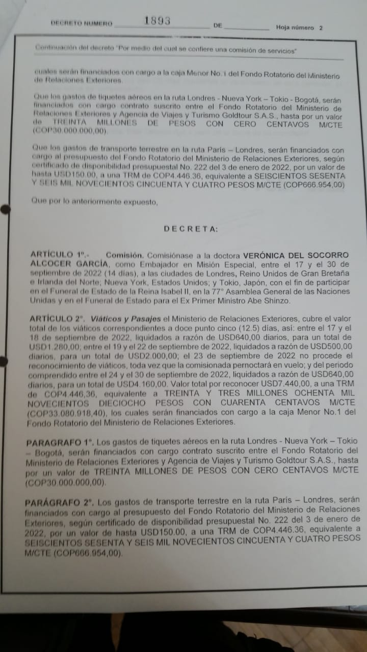 A través del decreto 1893 del 2022 el presidente Gustavo Petro nombró a la primera dama Verónica Alcocer como ‘Embajador en Misión Especial’ para que desarrollara diferentes visitas de estado en representación del gobierno, una de ellas al funeral de la reina Isabel II en Londres.