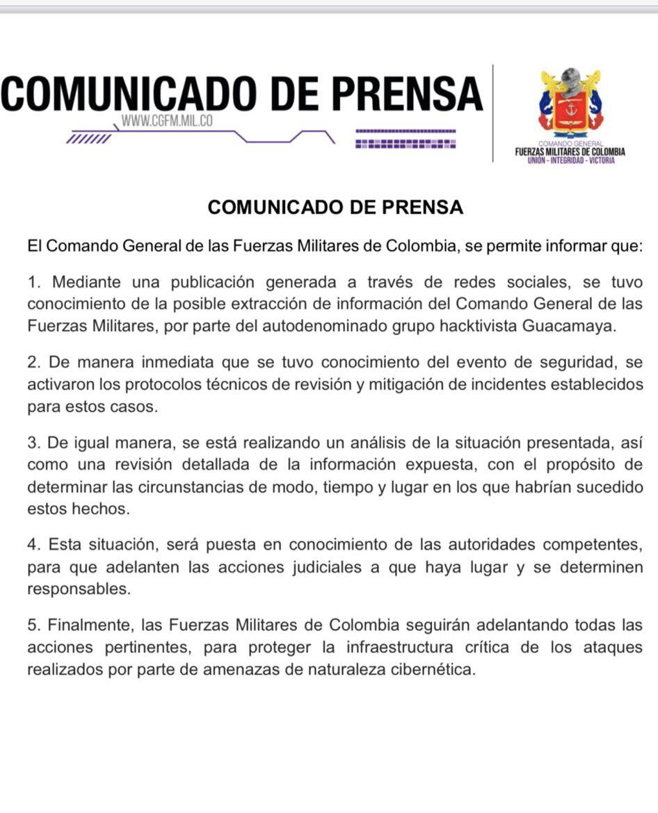 Añaden que de manera inmediata que se tuvo conocimiento del evento de seguridad, se activaron los protocolos técnicos de revisión y mitigación de incidentes establecidos para estos casos. “Las Fuerzas Militares de Colombia seguirán adelantando todas las acciones pertinentes, para proteger la infraestructura crítica de los ataques realizados por parte de amenazas de naturaleza cibernética.”