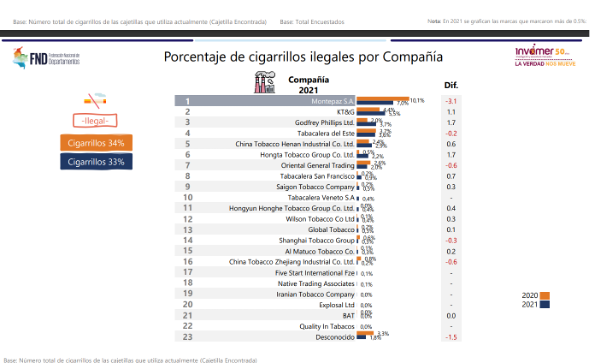 Y es que la ilegalidad de cigarrillos representa una cuarta parte del mercado de ese sector en el país, ubicándose en el 2021 en el 33%, así lo reveló la encuesta realizada por Invamer para la Federación Nacional de Departamentos (FND), que tuvo como muestra a 3.908 fumadores en los 32 departamentos y Bogotá.