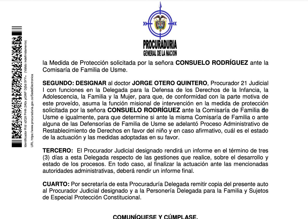 Mediante un documento que conoció Caracol Radio, la Procuraduría designó a Jorge Otero Quintero, procurador 21 judicial con funciones para Defensa de los Derechos de la Infancia, la Adolescencia, la Familia y la Mujer para que intervenga en la medida de protección que solicitó la señora Consuelo Rodríguez, madre del niño asesinado, ante la Comisaria de Familia de Usme y, además, determine qué medidas se han adoptado a su favor.
