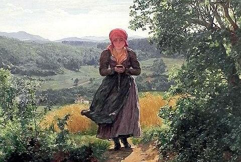 En la obra se ve como una mujer que pasea por el campo lleva en sus manos un objeto cuadrado, del tamaño muy cercano al de un celular. Muchos podrían decir que se trata de un libro que puede estar leyendo; sin embargo, si se detalla con más precisión, se puede notar como un pequeño destello de luz emana de él, tal cual al brillo de las pantallas de los teléfonos de hoy en día.