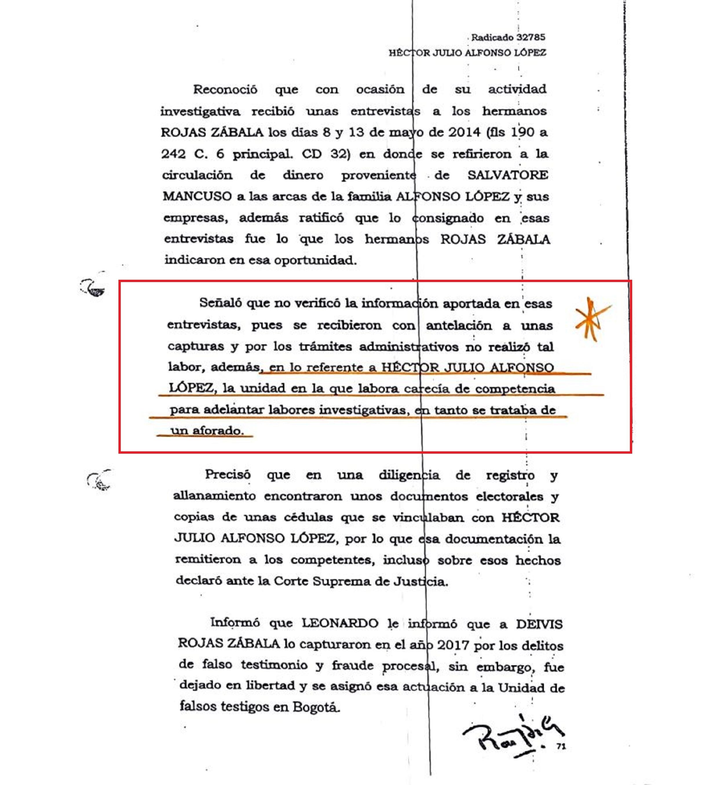 Héctor Julio Alfonso López, es investigado por la Corte Suprema por presuntos nexos con paramilitares. En el año 2018, el investigador de la Dijin declaró ante ese alto tribunal y dijo que no realizó labores en contra del excongresista por tratarse de un aforado.