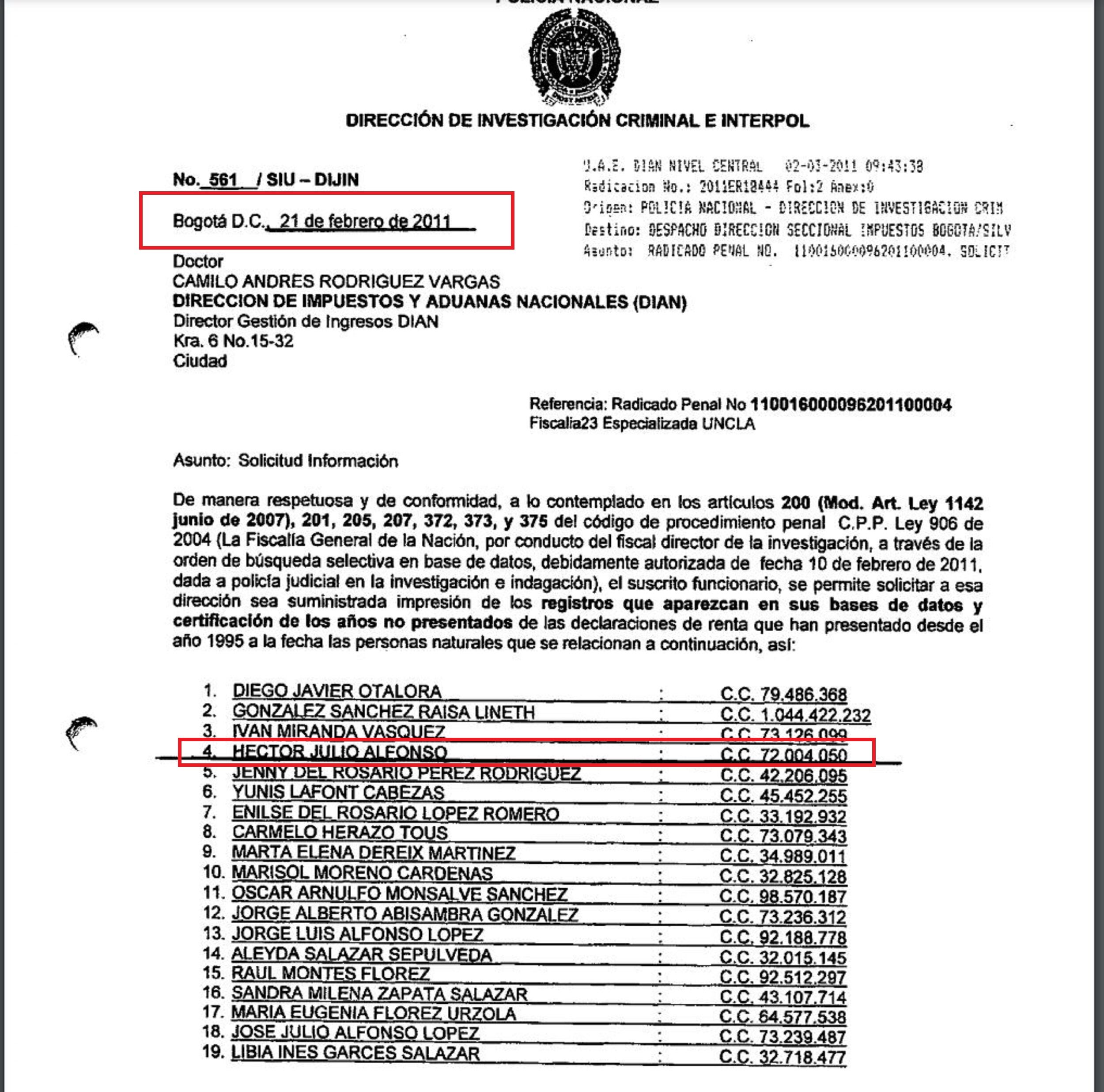 Héctor Julio Alfonso López fue elegido senador para el periodo 2010-2014 y la denuncia aporta al menos 21 documentos que acreditarían que entre los años 2011 y 2014, los dos funcionarios de la Fiscalía investigaron por el delito de lavado de activos a Enilce López, alias ‘La Gata’ y su núcleo familiar en cuyo listado incluyeron el nombre del entonces congresista.