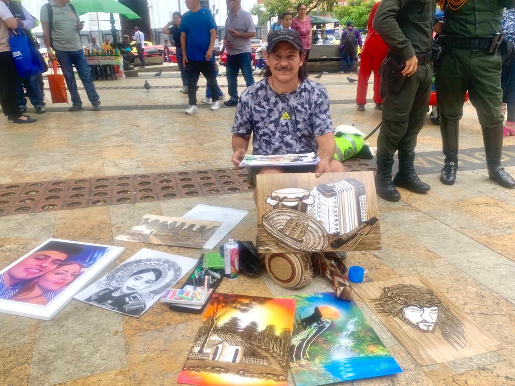 En una pequeña butaca, rodeado de pinturas y aerosoles se encuentra Juan de Dios Orozco en la mitad del Parque Santander de Bucaramanga, cuando nos acercamos ofreció retratarnos. Juan lleva 40 años pintando, ha detallado miles de rostros y ha plasmado en papel los mejores paisajes de Colombia.
