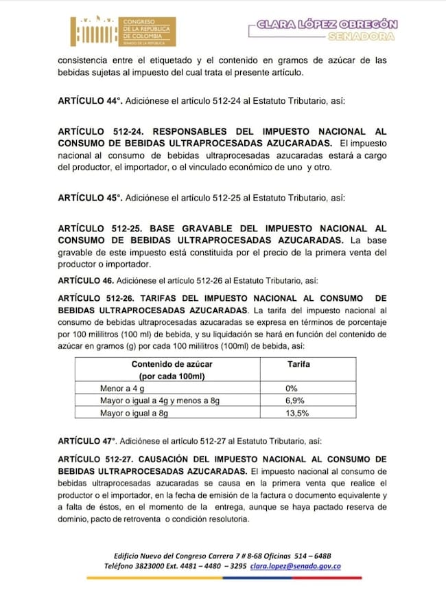 Y esta congresista es la que está proponiendo que el impuesto no sea en pesos sino en porcentajes. Por ejemplo, las gaseosas que tengan 4 gramos o menos de 8 gramos, por cada 100 mililitros, tendrían un impuesto del 6,9% sobre el precio del productor y si tienen 8 gramos o más el impuesto sería del 13.5%.