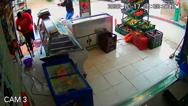 Una cámara de seguridad grabó el momento cuando un hombre identificado como Jhony Jaraba, fue ultimado a bala por sicarios que llegaron de manera repentina a la tienda donde permanecía, en el barrio Los Cerezos.