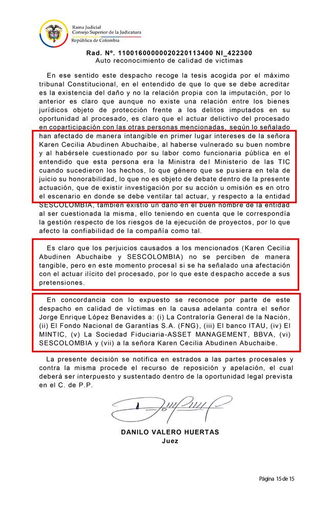 “(…) Se vulneró su buen nombre y al habérsele cuestionado por su labor como funcionaria pública en el entendido que esta persona era la Ministra del Ministerio de las TIC cuando sucedieron los hechos, lo que género que se pusiera en tela de juicio su honorabilidad (…) Es claro que los perjuicios causados a los mencionados (Karen Cecilia Abudinen Abuchaibe y SESCOLOMBIA) no se perciben de manera tangible, pero en este momento procesal si se ha señalado una afectación con el actuar ilícito del procesado, por lo que este despacho accede a sus pretensiones.” indica el auto del juez.