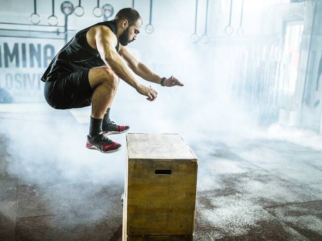 - Saltos al cajón: Este es uno de los ejercicios más típicos del crossfit se trata de ponerse frente a un cajón e impulsarse con las piernas para saltar y quedar encima de él. Se debe procurar amortiguar el salto con una leve flexión de rodillas.