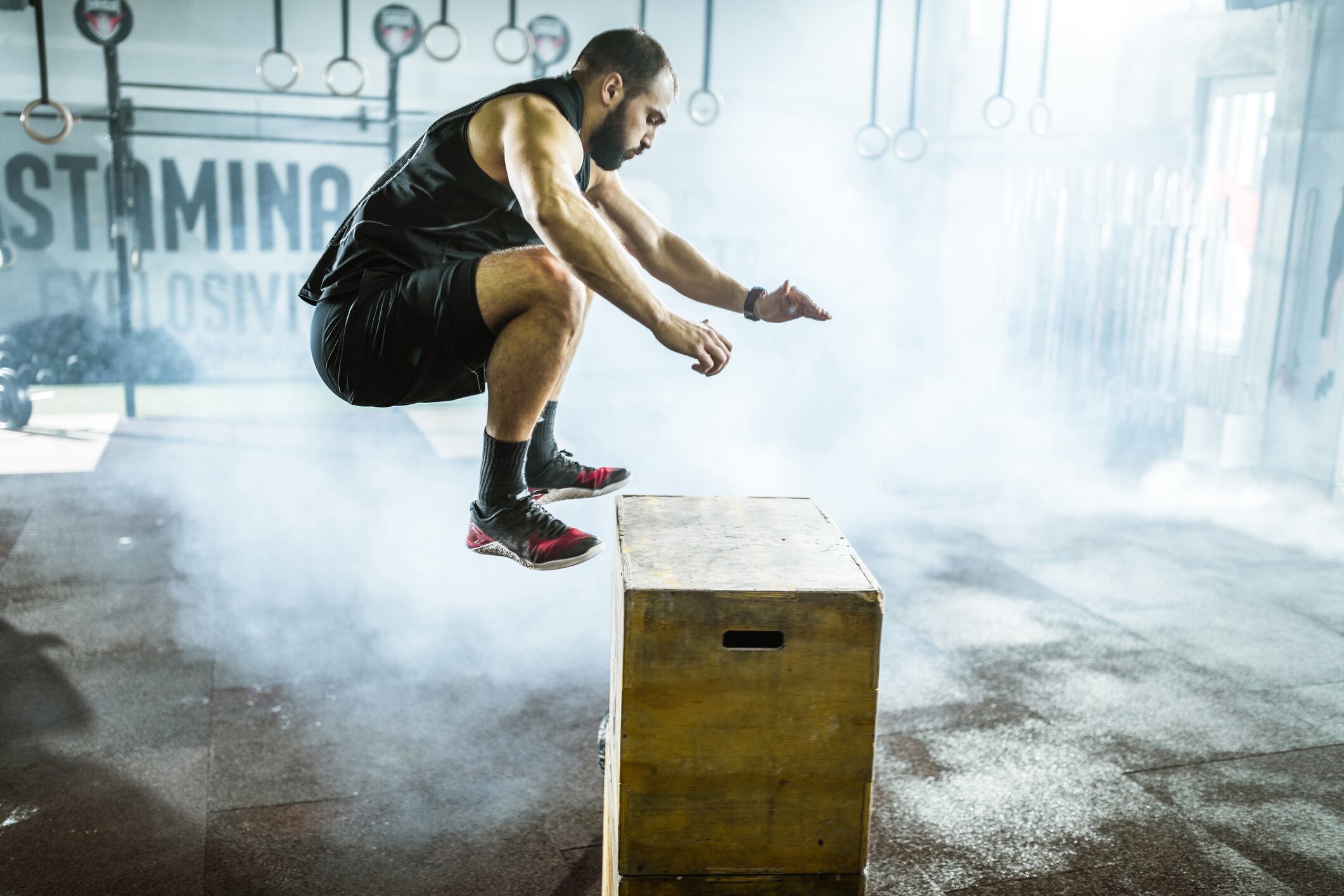 - Saltos al cajón: Este es uno de los ejercicios más típicos del crossfit se trata de ponerse frente a un cajón e impulsarse con las piernas para saltar y quedar encima de él. Se debe procurar amortiguar el salto con una leve flexión de rodillas.