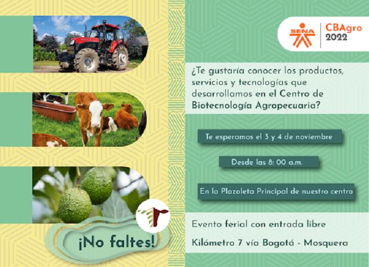 Los productores del sector agropecuario de Colombia, los emprendedores rurales, los profesionales que trabajan a favor del campo, los extensionistas que transfieren conocimiento sobre estas actividades, los estudiantes y todos los interesados en la producción agrícola y pecuaria, están llamados a participar entre el 3 y el 4 de noviembre de este año 2022, en la Feria CBAgro que se realizará en el Centro de Biotecnología Agropecuaria del SENA, en el municipio de Mosquera, departamento de Cundinamarca.