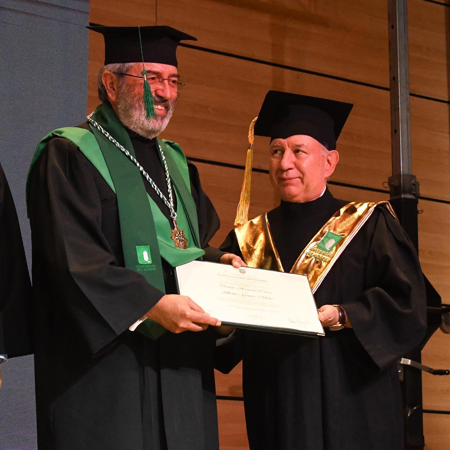 Además, el Rector de la Universidad del Quindío entregó a Alberto Gómez Mejía, el diploma que lo acredita como Doctor honoris causa.