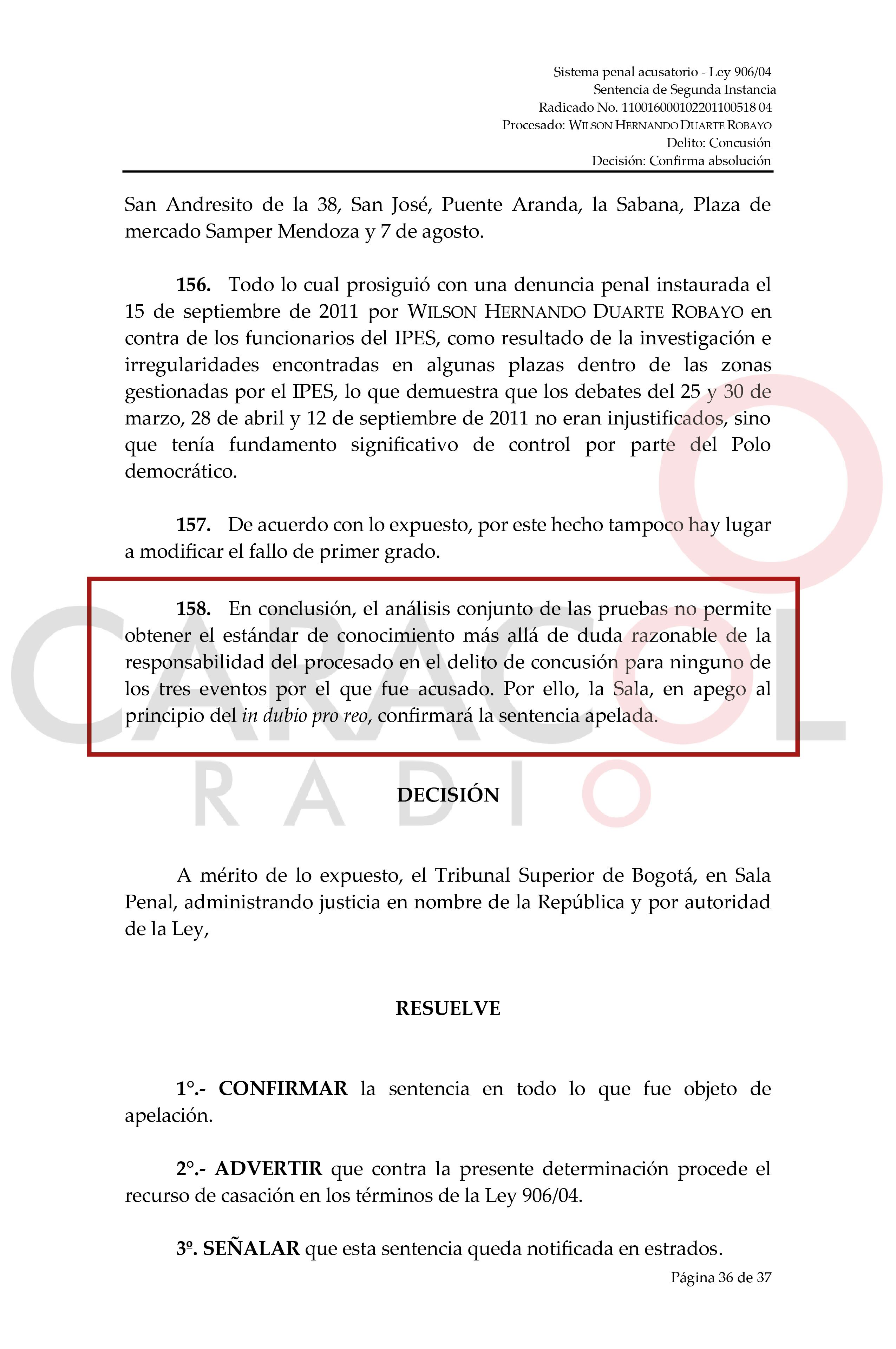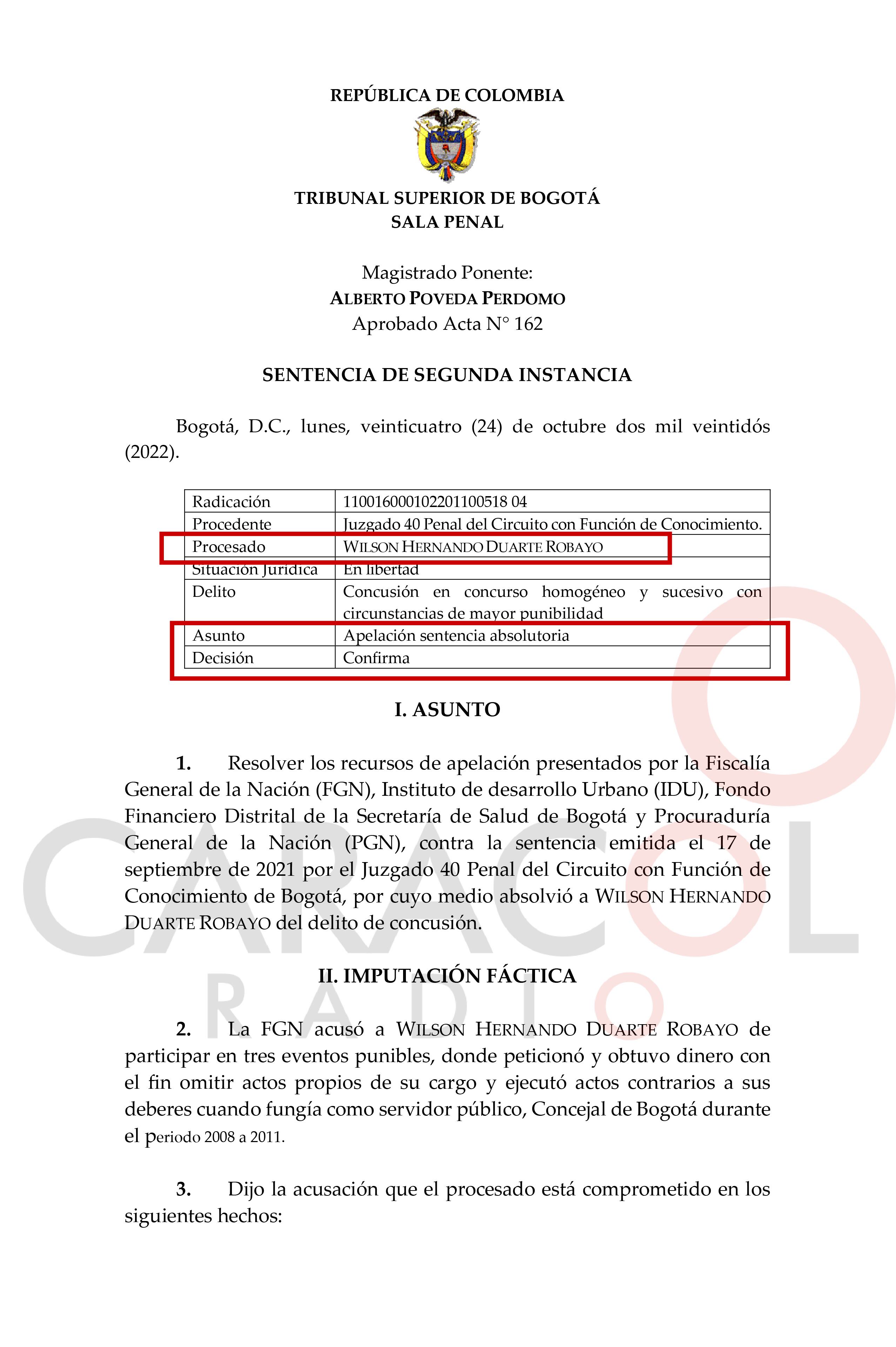 Fallo de segunda instancia del Tribunal Superior de Bogotá que ratificó la absolución del exconcejal Wilson Duarte