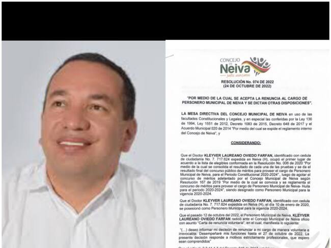 Tras la renuncia del titular Kleiver Laureano Oviedo como Personero de Neiva, el concejo municipal a través de la Resolución 074 nombró a Wilson Díaz Sterling, como el nuevo jefe del ministerio público para lo que resta del período 2020-2024, tras ser aceptada la renuncia de Oviedo Farfán.
