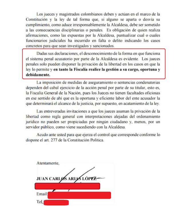Juan Carlos Arias López, magistrado del Tribunal Superior de Bogotá pidió esto al ministerio público por presuntos y reiterados ataques a la justicia, y por intromisión indebida en la rama judicial por parte de la alcaldesa de Bogotá, Claudia López.
