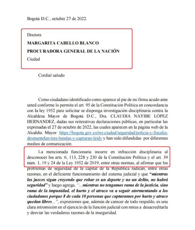 Aseguró finalmente que la Procuraduría ya radicó la queja y serán ellos quienes adelanten las investigaciones correspondientes, para saber si la alcaldesa de los bogotanos incurrió o no en una falta disciplinaria.