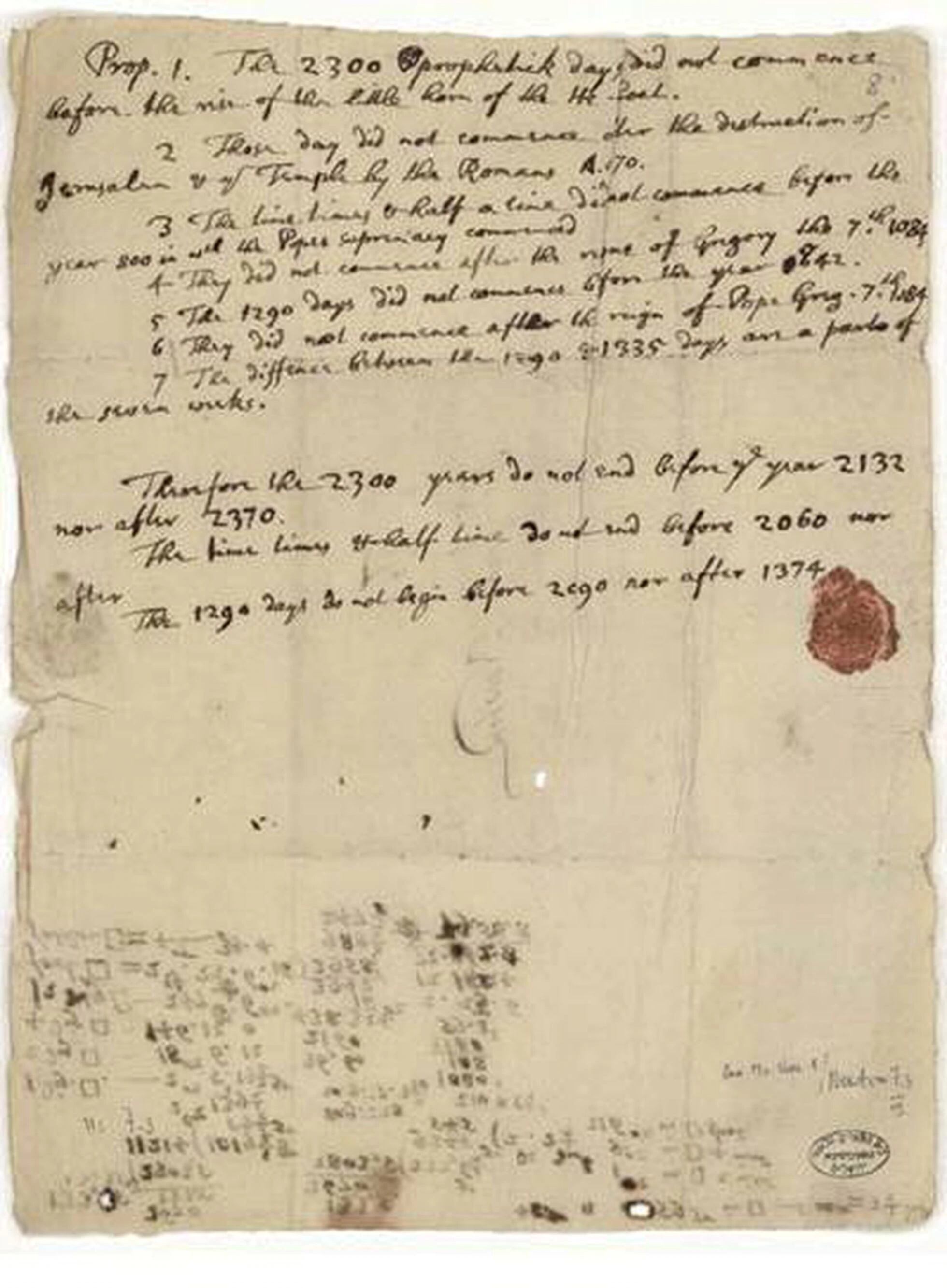 La Universidad Hebrea de Jerusalén hace casi cinco décadas recibió diferentes manuscritos del científico, en el cual se encontraba uno que Newton utilizó para calcular la fecha del fin del mundo a partir de un pequeño fragmento de la Biblia, en el libro de Daniel. En los escritos, el físico inglés asegura que el mundo se acabaría en 1.260 años, es decir, en el 2060.