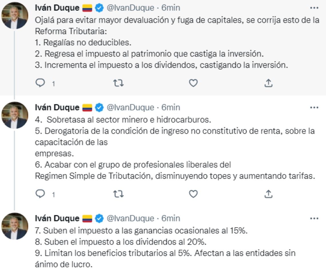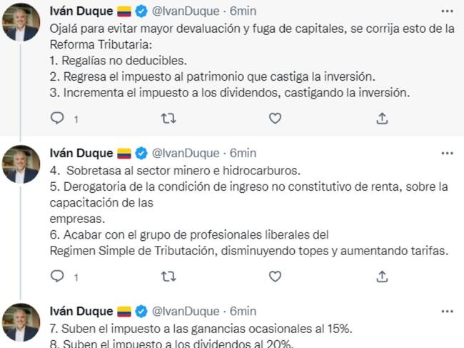 En un primer trino, el exmandatario escribió: “Ojalá para evitar mayor devaluación y fuga de capitales, se corrija esto de la Reforma Tributaria: