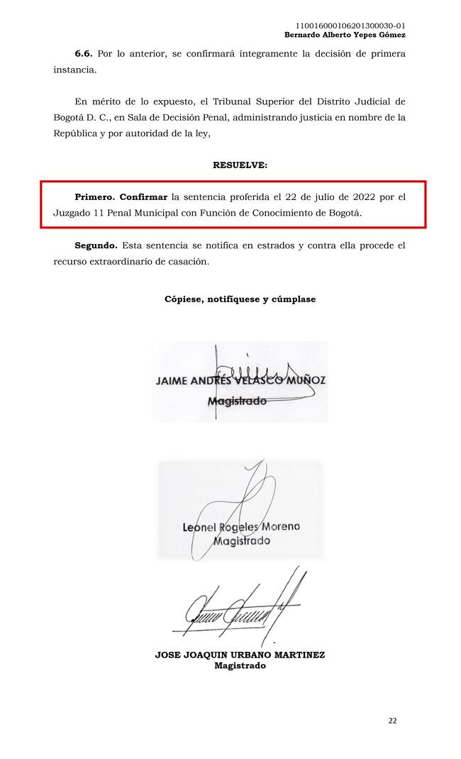 El Tribunal Superior de Bogotá ratificó la sentencia a seis años de prisión en contra del abogado bogotano Bernardo Alberto Yepes Gómez por el delito de violencia intrafamiliar agravada.