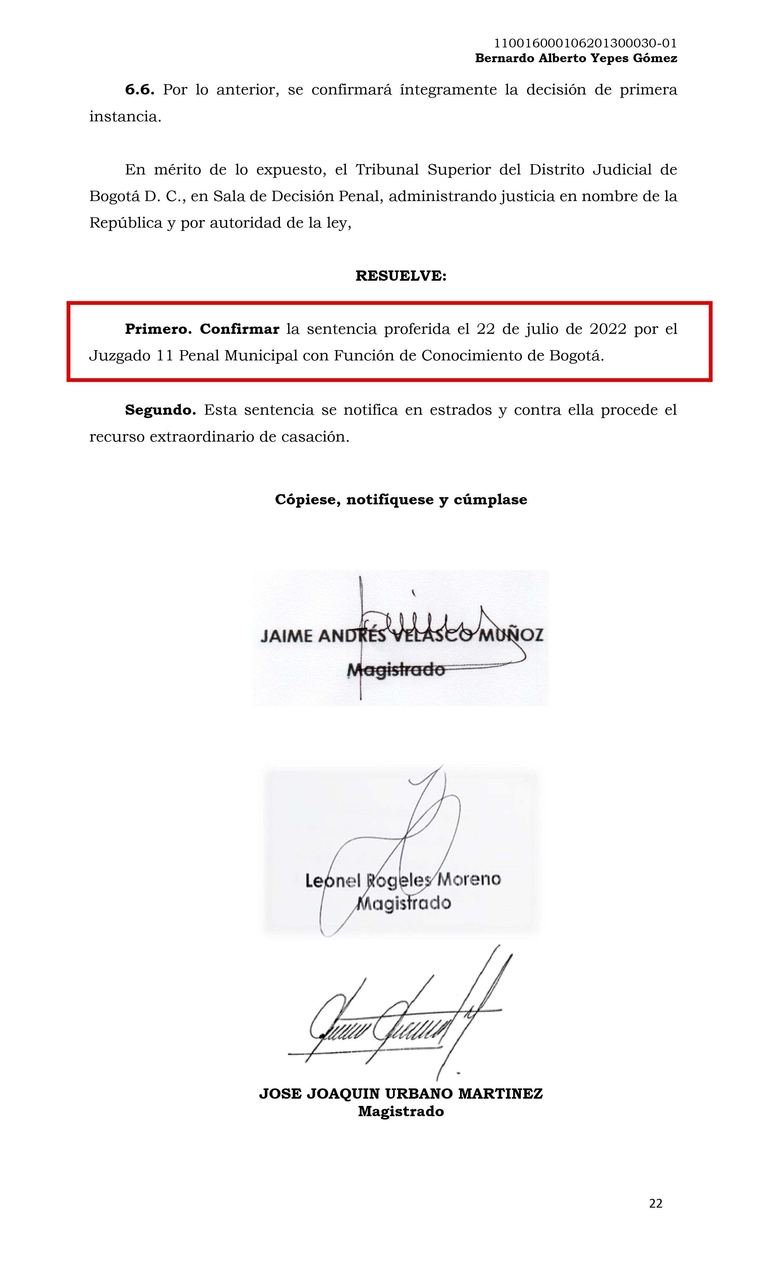 El Tribunal Superior de Bogotá ratificó la sentencia a seis años de prisión en contra del abogado bogotano Bernardo Alberto Yepes Gómez por el delito de violencia intrafamiliar agravada.